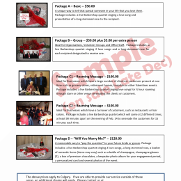 Ideal for Businesses which have a large number of clients or customers present at one time such as grocery stores, retirement homes, hospitals or other Valentines events. Package includes: a live Barbershop quartet singing love songs for ½ hour roaming through store or other venue serenading the clients or customers.